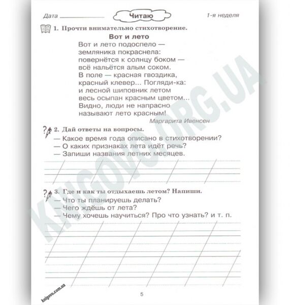 В данном пособии предлагаются задания по русскому языку, чтению, математике, природоведению, которые распределены по месяцам и неделям.