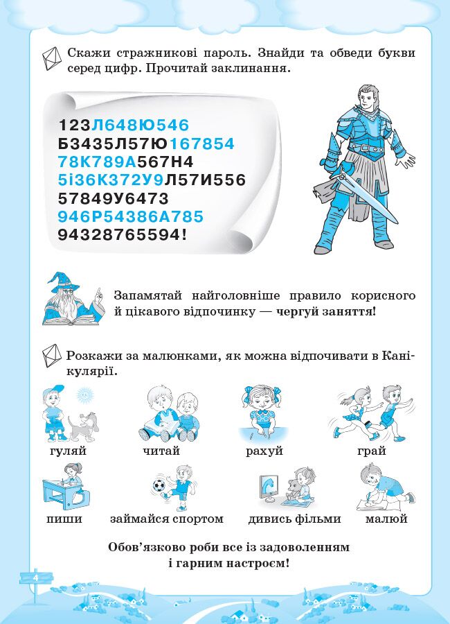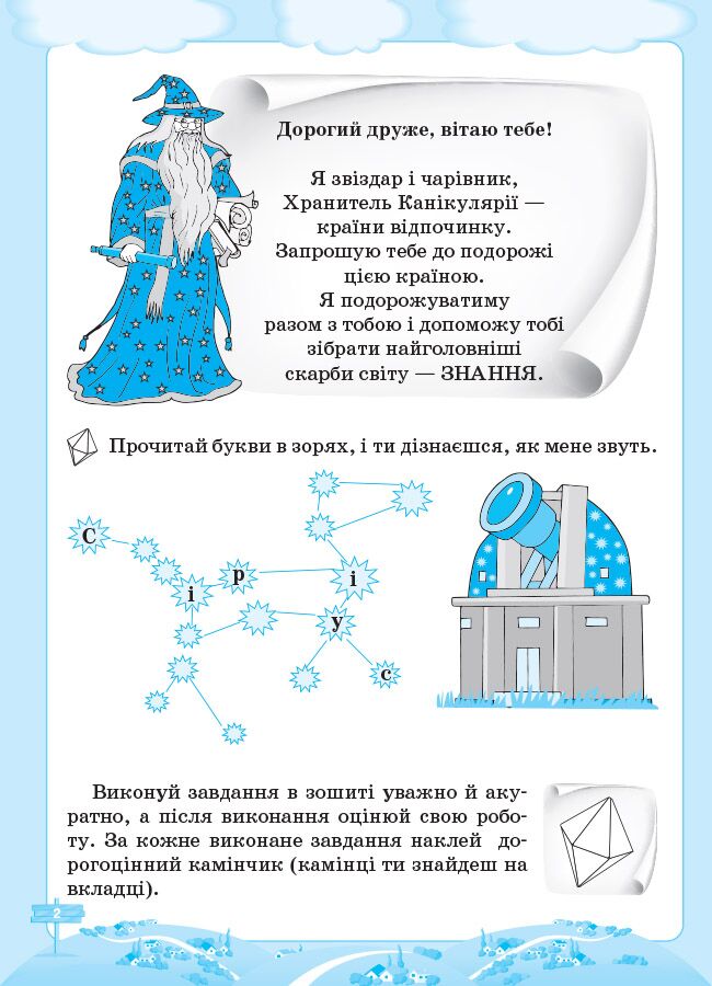 «Подорож країною Канікулярія» — це зошит, який дозволяє організувати роботу учнів 1-го класу на канікулах. Мандруюючи Канікулярією, учні в ігровій формі закріплюють отримані знання, розв’язують кросворди, загадки, головоломки, вдосконалюють набуті навички, розвивають мислення, уяву, пам'ять, мовлення, дрібну моторику.