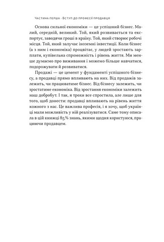 \nВи дізнаєтесь, як визначати біль клієнта, презентувати пропозицію і доносити її цінність, озвучувати ціну, опрацьовувати заперечення та боротися з ігнором, а також — як розбудувати ефективний відділ продажів. Книжка буде корисною продавцям, керівникам відділів продажів, власникам бізнесів, маркетологам і фрилансерам.