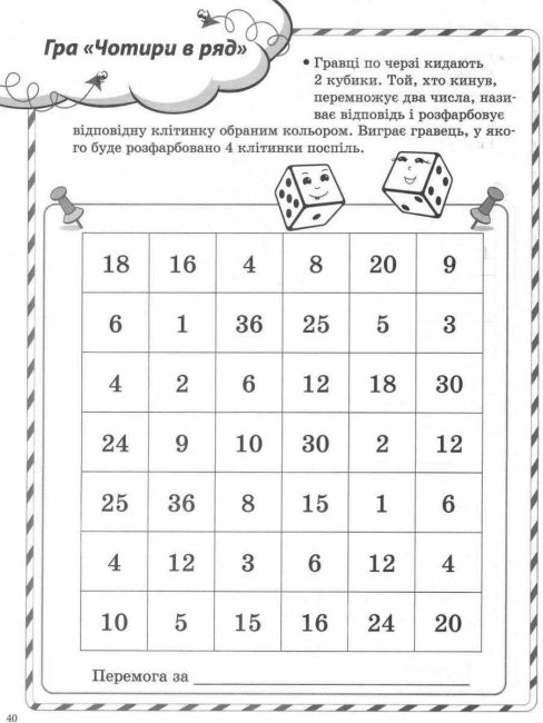 Посібник містить цікаві ігрові завдання з математики для учнів 2-го класу. За допомогою матеріалів збірки вчитель матиме змогу активізувати розумову діяльність учнів, організувати індивідуальну та парну роботу на уроках математики й в позаурочний час, а для учнів, які мають швидкий темп роботи, ігрові завдання стануть додатковими тренажерами.