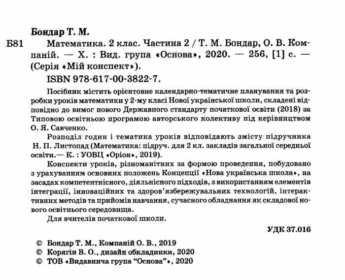 Мій конспект Математика 2 клас Частина 2 За підручником Н. Листопад НУШ. Посібник містить орієнтовне календарно-тематичне планування та розробки уроків математики у 2-му класі Нової української школи, складені відповідно до вимог нового Державного стандарту початкової освіти 2018 за Типовою освітньою програмою авторського колективу під керівництвом О. Я. Савченко.
