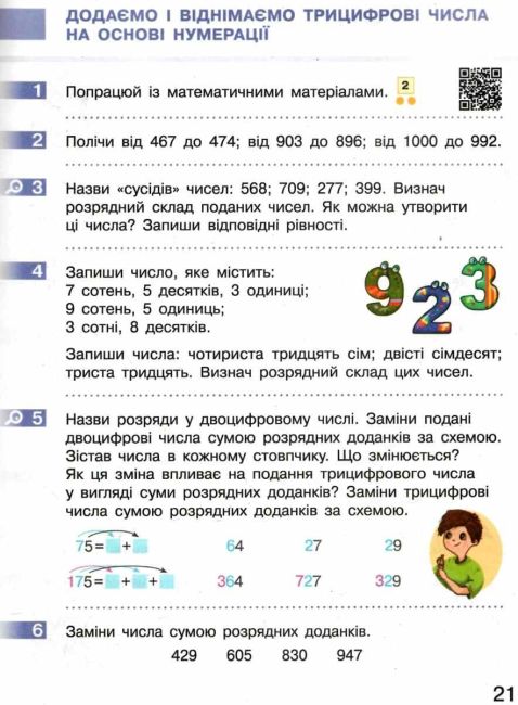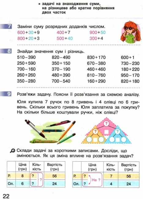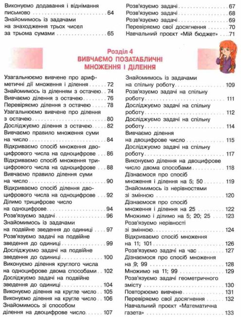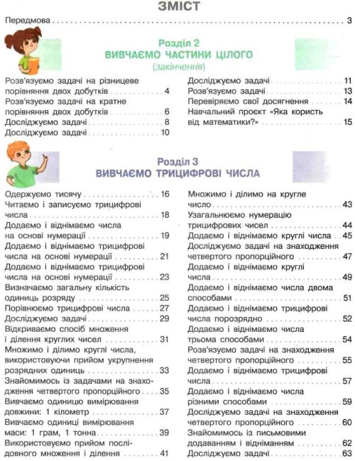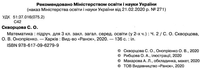 Підручник Математика 3 клас Частина 2 НУШ С. Скворцова, О. Онопрієнко Ранок. Підручник створений за Типовою освітньою програмою, розробленою під керівництвом О. Я. Савченко. Підручник містить елементарні теоретичні відомості; візуальні опори у вигляді пам’яток, схем, зразків міркувань; системи завдань на актуалізацію опорних знань, створення проблемної ситуації та її розв’язання, первинне закріплення, формування вмінь і навичок, неперервне повторення. Авторська методична система, реалізована в підручнику, спрямована на формування в учнів навичок лічби та арифметичних обчислень, уміння працювати з математичними задачами, завданнями геометричного та логічного характеру.