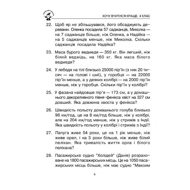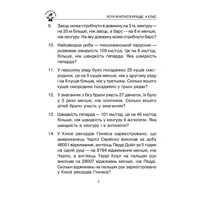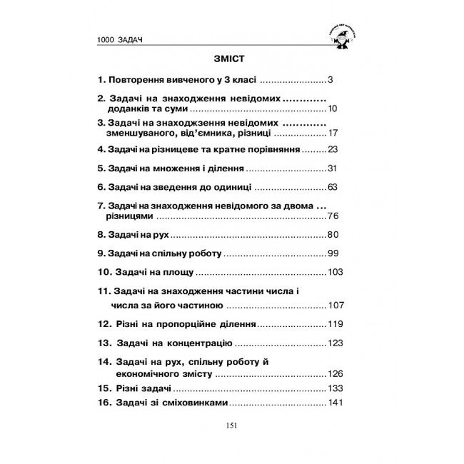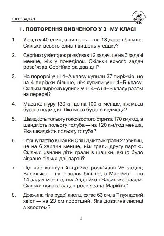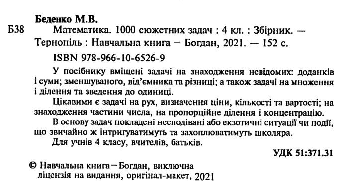Математика 4 клас 1000 задач Збірник НУШ Беденко М. Богдан. У посібнику вміщені задачі на знаходження невідомих: доданків і суми; зменшуваного, від’ємника та різниці; а також задачі на множення і ділення та зведення до одиниці.