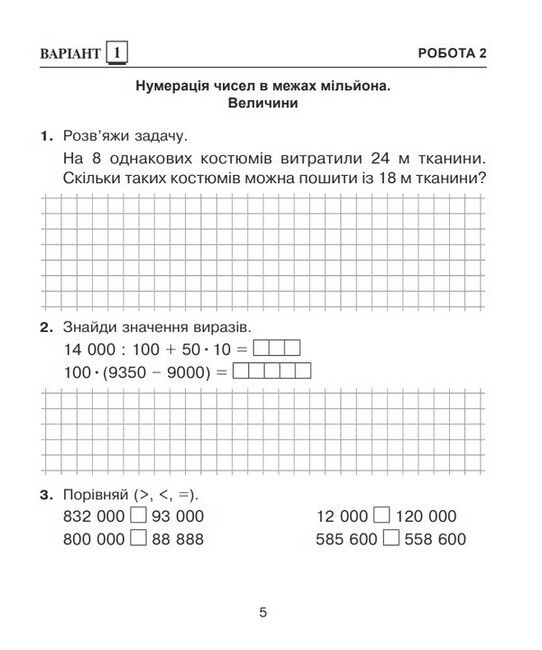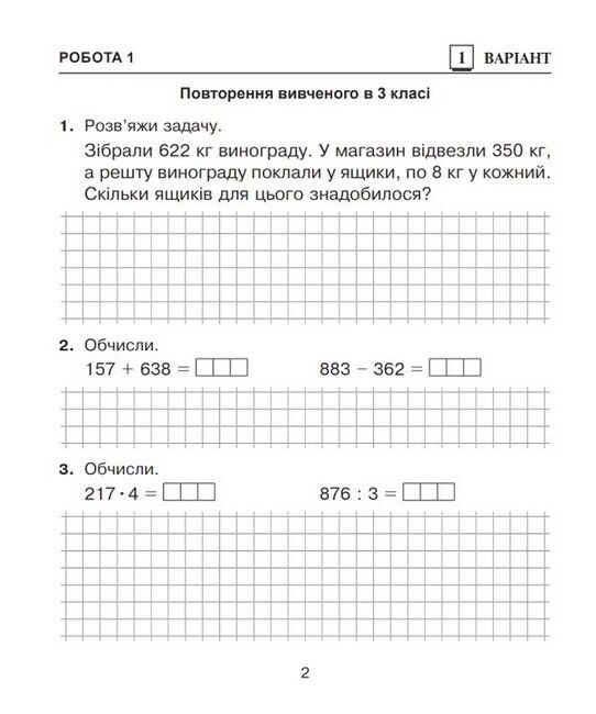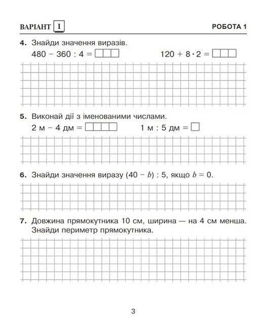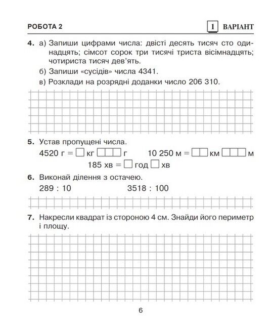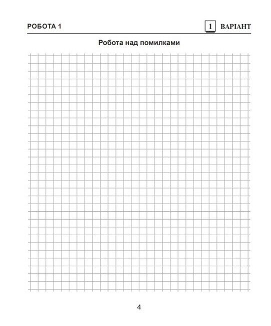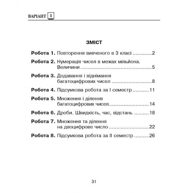 У зошиті запропоновано 8 тематичних діагностичних робіт, по 2 варіанти у кожній, зміст яких відповідає Державному стандарту початкової освіти, Типовій освітній програмі, розробленій під керівництвом О.Я. Савченко, та підручнику «Математика. 4 кл.», у 2-х част. (авт. Листопад Н. П.). Роботи №№ 1, 2, 3, 5, 6, 7 складаються із 8 завдань на обчислення, розв’язування задачі, рівняння або нерівності, знаходження значення виразу із буквою, завдань з іменованими числами, геометричного матеріалу та творчого завдання. Роботи №№ 4, 8 містять 7 тестових завдань закритого та відкритого типів. У зошиті відведено місце для роботи над помилками. Для учнів та учениць 4 класу.