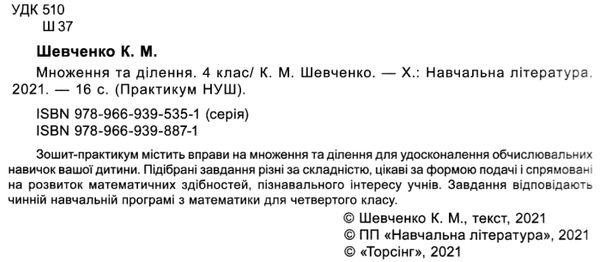 Практикум Математика Множення та ділення 4 клас НУШ Авт: Шевченко К.М. Вид-во: Торсінг 62790