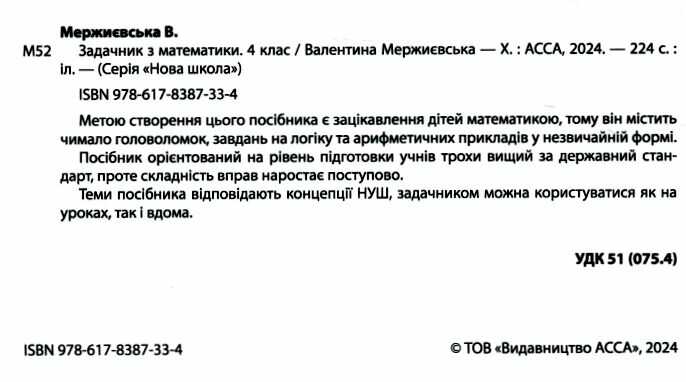 Школа розумників Задачник з математики 4 клас НУШ Авт: В. Мержиєвська Вид-во: АССА 104060