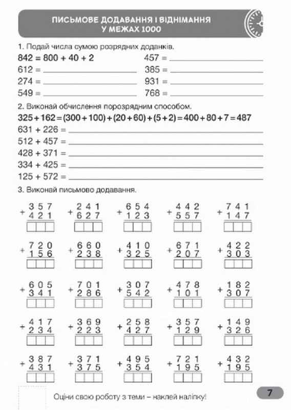 Окрім того, ми пропонуємо способи обчислень і даємо зразки (виділено напівжирним). Таким чином дорослі можуть перевірити хід виконання завдань учнями і, якщо була допущена помилка, разом виправити.