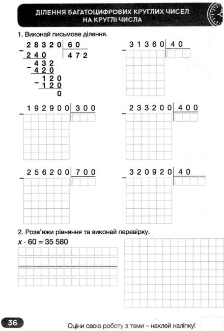 Супертренажер з математики 4 клас НУШ із наліпками Козаченко О. Літера. Регулярна робота з цим посібником допоможе учням 4 класу автоматизувати обчислювальні навички, стати більш уважними і самостійними. Посібник призначений передусім для тренування, а тому тут не передбачено вправляння в каліграфічному написанні чисел — іноді замість клітинок використано лінії.
