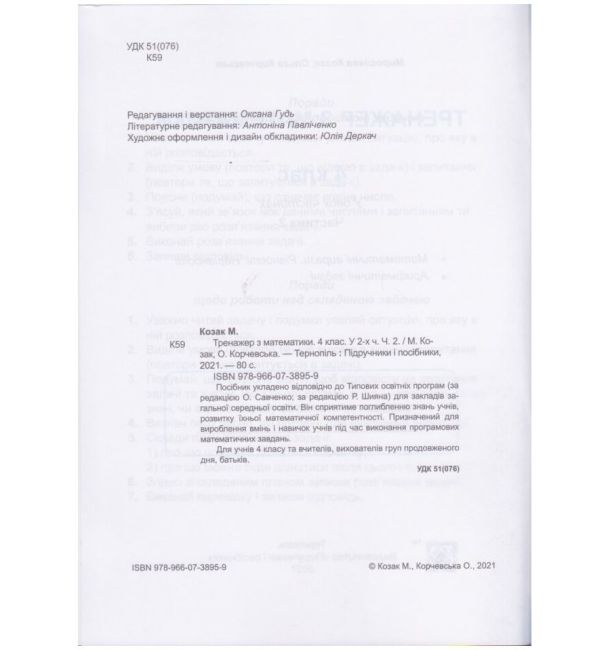 Нова українська школа Тренажер з математики 4 клас Частина 2 НУШ Козак М. Корчевська О. Підручники і посібники. Посібник укладено відповідно до Типових освітніх програм (за редакцією О. Савченко, за редакцією Р. Шияна) для закладів загальної середньої освіти.