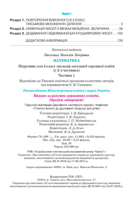 Підручник Математика 4 клас Частина 1 НУШ Листопад Н. Оріон. Підручник для 4 класу закладів загальної середньої освіти (у 2-х частинах).