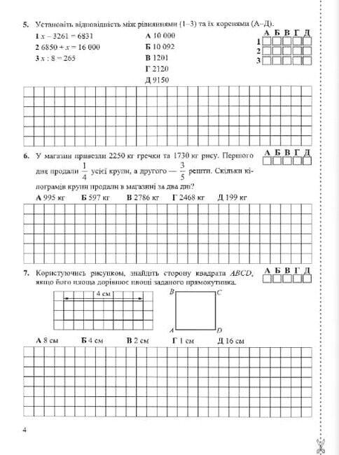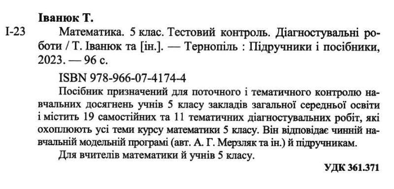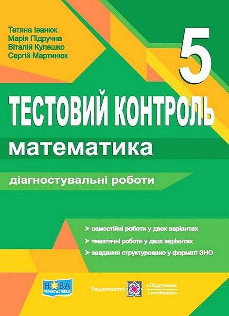 Посібник призначений для поточного і тематичного контролю навчальних досягнень учнів 5 класу закладів загальної середньої освіти і містить 19 самостійних та 11 тематичних діагностувальних робіт, які охоплюють усі теми курсу математики 5 класу. Він відповідає чинній навчальній модельній програмі (авт. А. Г. Мерзляк та ін.) й підручникам.