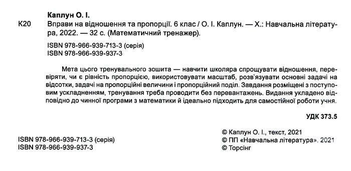 Математичний тренажер Вправи на відношення та пропорції 6 клас Розв'язуй легко Каплун О. Торсінг. Мета цього тренувального зошита - навчити школяра спрощувати відношення, перевіряти, чи є рівність пропорцією, використовувати масштаб, розв`язувати основні задачі на відсотки, задачі на пропорційні величини і пропорційний поділ.