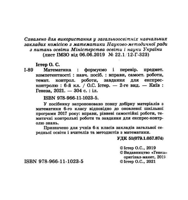 Математика Вправи самостійні роботи тематичні контрольні 6 клас Програма 2019 Авт: Істер О. Вид: Генеза