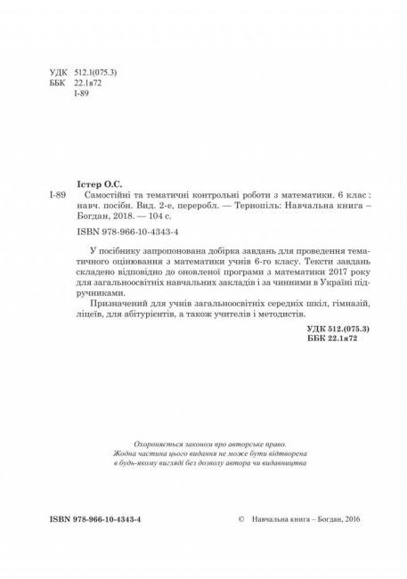 Самостійні та тематичні контрольні роботи Математика 6 клас Оновлена програма Авт: Істер О.С. Вид-во: Богдан 19361