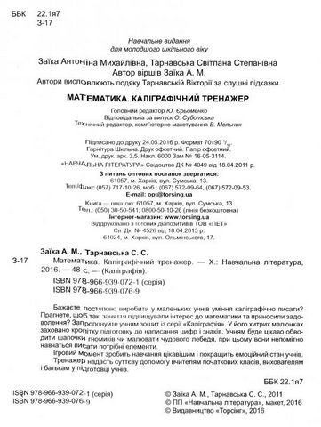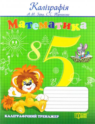 "Каліграфія. Математика. Каліграфічний тренажер" від Світлани Тарнавської та Антоніни Заїки, видавництва Торсінг - це навчальний посібник, який поєднує в собі навчання каліграфії та математики.