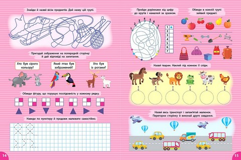 У книзі «Увага та пам’ять» містяться завдання, у яких дитина впізнаватиме предмети за їхніми контурами, відтворюватиме по пам’яті послідовність малюнків та їхні кольори, установлюватиме вид споруд згори й збоку, працюватиме з множинами й розгадуватиме судоку, повторюватиме лінії по точках, малюватиме візерунки по клітинках тощо. Завдання такого виду сприятимуть розвитку уваги й пам’яті дитини, а використання наліпок під час роботи покращить дрібну моторику пальців рук.