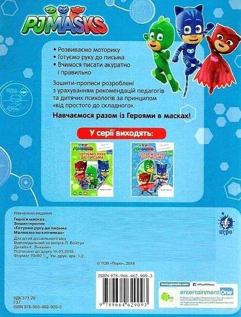 Зошити-прописи розроблені з урахуванням рекомендацій педагогів та дитячих психологів за принципом 'від простого до складного'. Учитися писати простіше і веселіше з героями улюблених мультфільмів!