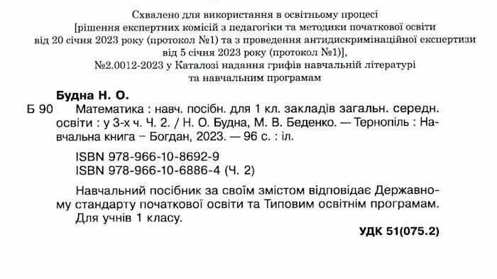 Навчальний посібник Математика 1 клас у 3-х частинах Частина 2 НУШ Авт: Будна Н.О. Беденко М.В. Вид-во: Богдан 90894