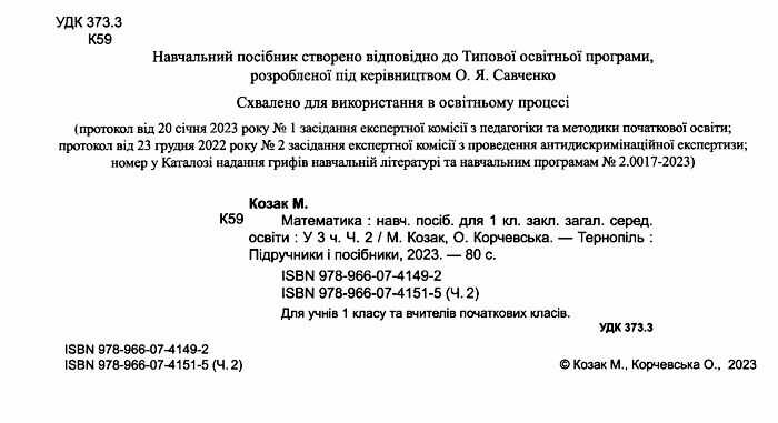 Навчальний посібник Математика 1 клас у 3-х частинах Частина 2 НУШ Авт: Козак М.В. Корчевська О.П. Вид-во: Підручники і посібники 101208