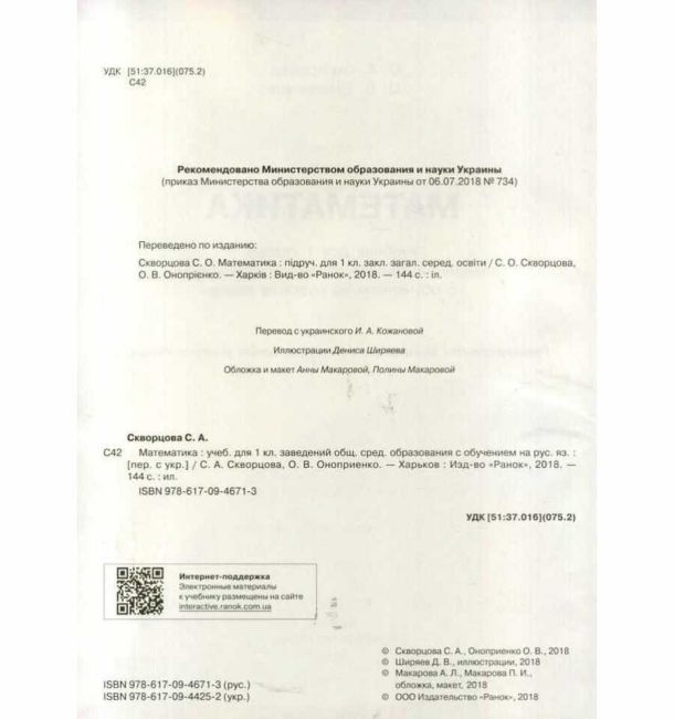Учебник Математика 1 класс НУШ Авт: Скворцова С. Изд: Ранок
