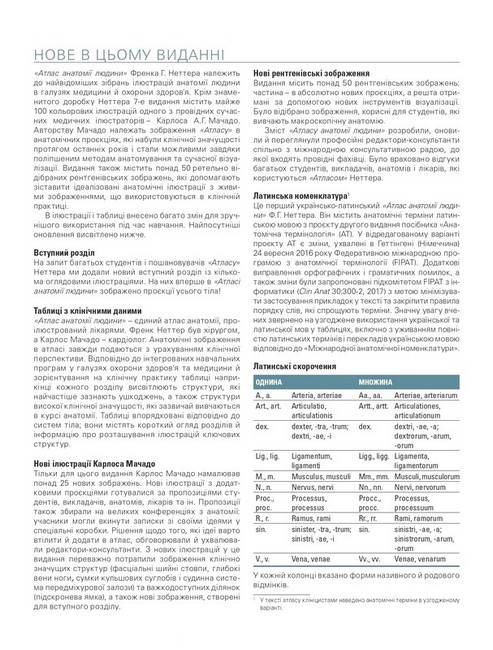 «Атлас анатомії людини з латинською термінологією» Френка Г. Неттера належить до найвідоміших зібрань ілюстрацій анатомії людини в галузях медицини й охорони здоров'я. У ньому ви знайдете визнані світом винятково чіткі зображення людського тіла з урахуванням клінічної перспективи. Крім знаменитого матеріалу Неттера видання містить майже 100 кольорових ілюстрацій Карлоса А.Г. Мачадо, одного з провідних сучасних медичних ілюстраторів. Авторству Мачадо належать зображення «Атласу» в анатомічних проекціях, які набули клінічної значущості протягом останніх років і стали можливими завдяки поліпшеним методам анатомування та сучасної візуалізації. Видання також містить понад 50 ретельно відібраних рентгенівських зображень, що допомагають зіставити ідеалізовані анатомічні ілюстрації з живою анатомією, якою її бачать у щоденній практиці.