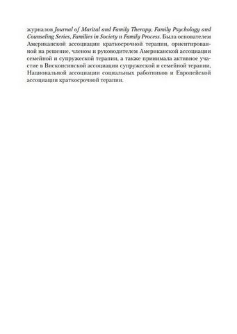 Это новаторская, интеллектуально провокационная книга, раскрывающая новые достижения в широко используемом и основанном на фактических данных подходе ориентированной на решение краткосрочной терапии (ОРКТ). В своей работе всемирно известные семейные терапевты и разработчики ОРКТ Стив де Шейзер и Инсу Ким Берг (скончавшиеся незадолго до выхода книги) информируют практиков и студентов о том, как применять этот практический всемирно известный подход. В этом классическом издании с новым предисловием представлены последние разработки в области семейной терапии и краткосрочной терапии, а также в области обучения и практики психотерапии.