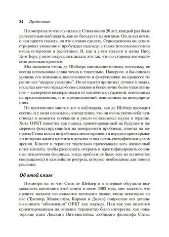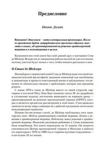 Книга, написанная экспертами-новаторами в этой области, остается авторитетным руководством по ориентированной на решение краткосрочной терапии (ОРКТ). В своей работе всемирно известные семейные терапевты и разработчики ОРКТ Стив де Шейзер и Инсу Ким Берг (скончавшиеся незадолго до выхода книги) информируют практиков и студентов о том, как применять этот практический всемирно известный подход.