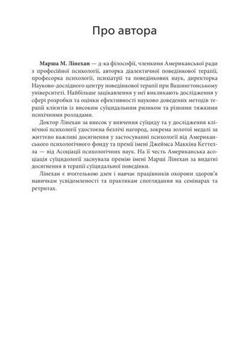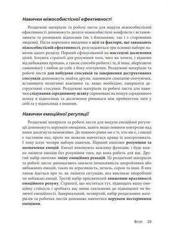 Книга є збірником робочих листів і роздаткових матеріалів, за допомогою яких змінюється досвід, що травмує, та формуються здорові реакції на дистрес. ДПТ поєднує в собі елементи класичної психотерапії, практики дзен, діалектичний підхід та когнітивно-поведінкові методики. Під час цієї терапії клієнти набувають навичок ефективного спілкування та навчаються долати стрес, використовуючи навички усвідомленості - постійного включення в реальність.
