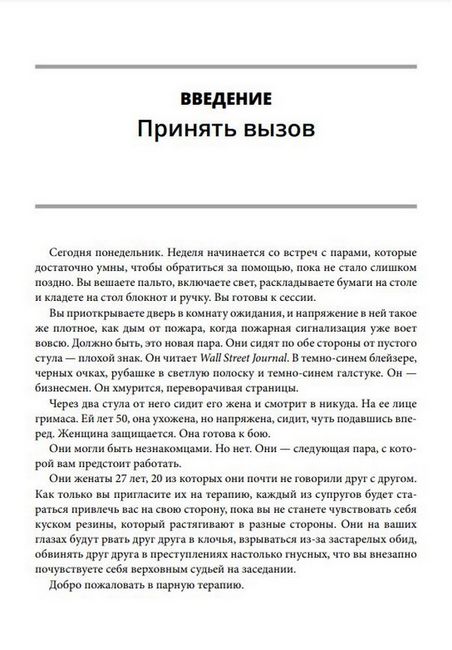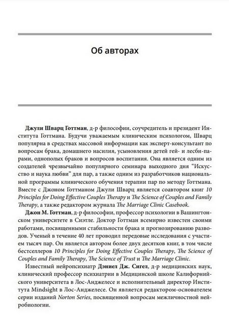 Практическое пособие разработано специально для тех, кто хочет углубить свои знания о супружеской терапии. Книга призвана помочь терапевтам подойти к семейной терапии с надеждой и уверенностью, а не с трепетом и дрожью. Авторы остановились на 10 принципах, которые считают наиболее полезными и применимыми для всех видов терапевтических подходов. Они - результат работы за те годы, что Джули и Джон Готтман провели, наблюдая за парами в лаборатории и в консультационном кабинете.