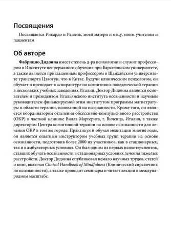 В этой книге представлена первая программа лечения, в которой проверенные виды практики когнитивной терапии на основе осознанности (КТНОО) адаптированы для удовлетворения особых потребностей людей, страдающих обсессивно-компульсивным расстройством (ОКР). Автор книги, Фабрицио Дидонна — ведущий и авторитетный специалист в данной области, наглядно показывает, каким образом методы подобного осознанного воздействия могут быть особым образом приспособлены для оказания помощи людям, страдающим ОКР, в преодолении навязчивых мыслей и компульсивных ритуалов, развивая в то же время взаимосвязь с их внутренними переживаниями. В этой книге приведены в удобной форме подробные инструкции для реализации каждого из 11 сеансов терапии по рассматриваемой в ней программе лечения ОКР методом КТНОО, полное описание воспроизводимых и направляемых упражнений в осознанности, а также раздаточные информационные материалы для пациентов.