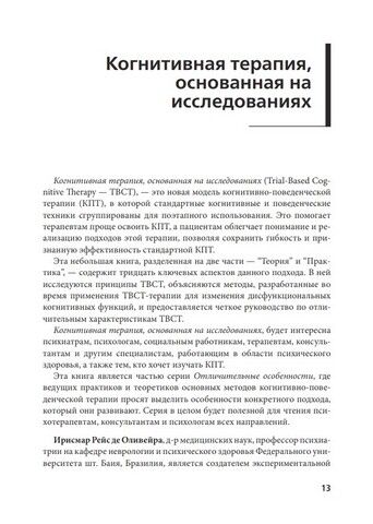 Эта небольшая книга, разделенная на теоретическую и практическую части, содержит тридцать ключевых аспектов данного подхода. В ней исследуются принципы ТВСТ, объясняются методы, разработанные во время применения ТВСТ-терапии для изменения дисфункциональных когнитивных функций, и предоставляется четкое руководство по отличительным характеристикам ТВСТ.
