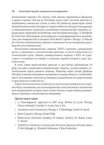 “Книга Ирисмара Рейс де Оливейры — выдающийся вклад в КПТ. С самого начала становится совершенно ясно, что автор — мастер-клиницист. Де Оливейра разработал инновационный, мощный, структурированный подход, который может помочь клиницистам изменить проблемные стили мышления и поведения. Книга написана в очень доступной манере, читателю предоставляются бесчисленные клинические методы и примеры. Всем, кто интересуется новыми рубежами когнитивной терапии, будет полезно прочитать данное руководство и использовать изложенные в нем творческие идеи. Я настоятельно рекомендую это творческое новое дополнение к библиотеке когнитивной терапии для клиницистов любого уровня квалификации”.