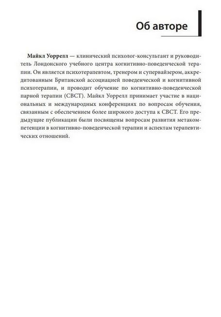 Майкл Уоррелл — клинический психолог-консультант и руководитель Лондонского учебного центра когнитивно-поведенческой терапии. Он является психотерапевтом, тренером и супервайзером, аккредитованным Британской ассоциацией поведенческой и когнитивной психотерапии, и проводит обучение по когнитивно-поведенческой парной терапии (CBCT). Майкл принимает участие в национальных и международных конференциях по вопросам обучения, связанным с обеспечением более широкого доступа к CBCT. Его предыдущие публикации были посвящены вопросам развития метакомпетенции в когнитивно-поведенческой терапии и аспектах терапевтических отношений.