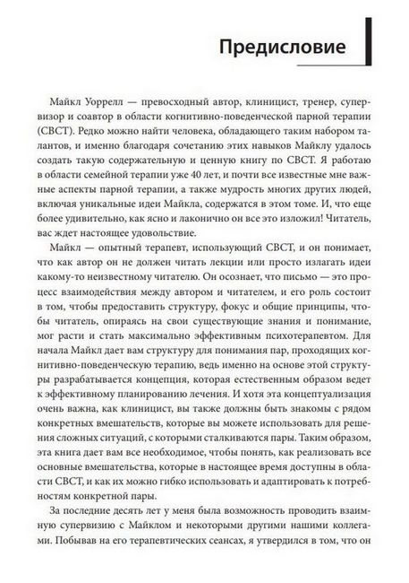 Эта краткая книга, содержащая 30 основных положений и разделенная на теоретическую и практическую части, включает многочисленные клинические примеры, которые иллюстрируют ключевые особенности когнитивно-поведенческой парной терапии. Она станет прекрасным руководством как для студентов, так и для опытных психотерапевтов, практикующих индивидуальную когнитивноповеденческую терапию, а также парную терапию из других теоретических направлений, которым требуется доступное методическое пособие по отличительным теоретическим и практическим особенностям этого современного подхода.