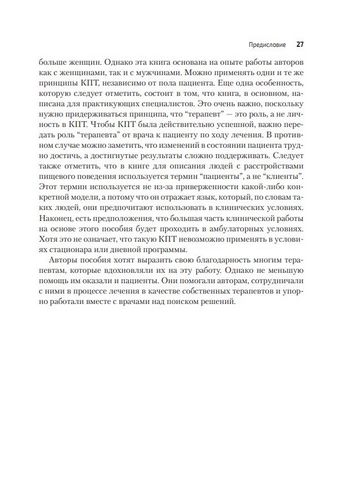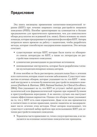 Эффективность КПТ при РПП зависит от изучения таких вопросов, как мотивация, эмоциональное состояние, физическая безопасность, режим питания и психологическая коморбидность. В этом руководстве авторы подчеркивают важность вопросов развития, физических и системных проблем в разных возрастных группах, а также соответствующей системы поддержки в виде супервизии и мультипрофильной команды специалистов. В основу развития идей, изложенных в этой книге, лег клинический опыт авторов, их коллег и пациентов, хотя это не окончательная их позиция в отношении КПТ. Ведь для когнитивно-поведенческой терапии как главной психологической терапии для лечения расстройств пищевого поведения характерен процесс изменений и развития.