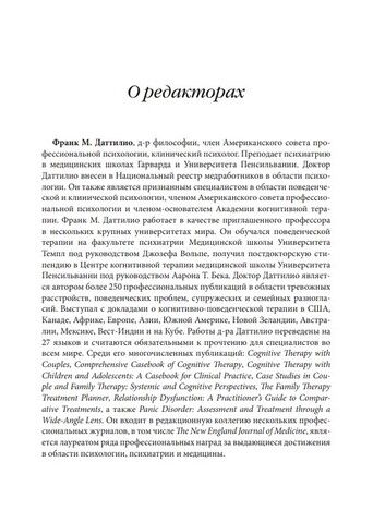 Франк М. Даттилио, д-р философии, член Американского совета профессиональной психологии, клинический психолог. Преподает психиатрию в медицинских школах Гарварда и Университета Пенсильвании. Он внесен в Национальный реестр медработников в области психологии. Доктор Даттилио, признанный специалист в области поведенческой и клинической психологии Американского совета профессиональной психологии, является членом-основателем Академии когнитивной терапии. Франк М. Даттилио работает в качестве приглашенного профессора в нескольких крупных университетах мира. Он обучался поведенческой терапии на факультете психиатрии Медицинской школы Университета Темпл под руководством покойного Джозефа Вольпе, получил постдокторскую стипендию в Центре когнитивной терапии медицинской школы Университета Пенсильвании под руководством Аарона Т. Бека. Опубликовал более 250 профессиональных публикаций в области тревожных расстройств, поведенческих проблем, супружеских и семейных разногласий.