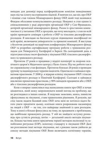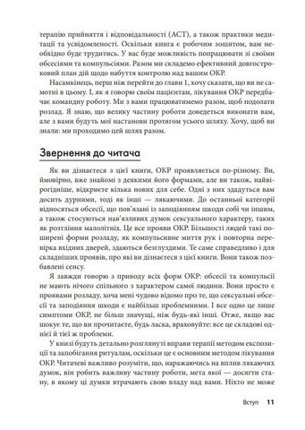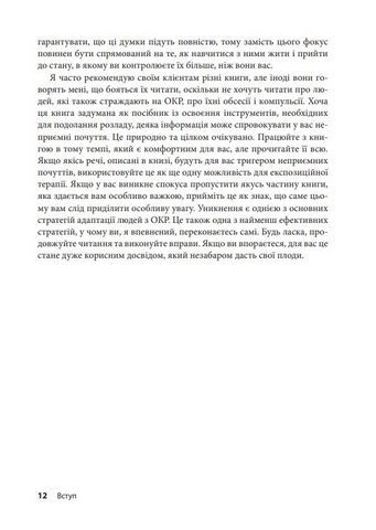 Книга є зручним посібником для самостійної роботи та поєднує когнітивно-поведінкову терапію, метод експозиції та запобігання ритуалам, а також практики усвідомленості в один простий покроковий план роботи.