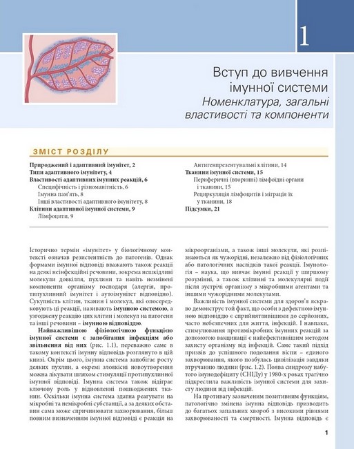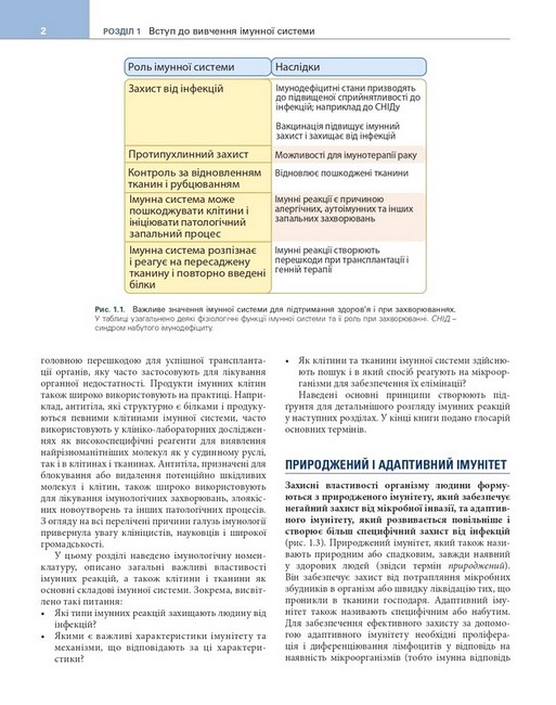 Цей сучасний, стислий, проте ґрунтовний посібник з імунології створено професійним колективом авторів. Матеріал викладено в доступній формі, ілюстровано численними інформативними малюнками й таблицями, що дає змогу глибше зрозуміти найважливіші поняття й принципи функціонування імунної системи. Значну увагу приділено клінічним аспектам імунології, патогенезу хвороб та розробленню нових методів лікування. Висвітлено особливості природженого й адаптивного імунітету, характеристики клітинної та гуморальної імунної відповіді, розглянуто питання імунологічної толерантності й аутоімунітету, імунології пухлин, зокрема імунотерапії, трансплантації, гіперчутливості, а також природжених і набутих імунодефіцитів. Книга містить 12 розділів, на початку кожного розділу подано його зміст, а в кінці — запитання для самоконтролю. Кожен розділ можна читати окремо, оскільки ключові ідеї повторюються в різних частинах книги, і це також сприяє кращому засвоєнню матеріалу.