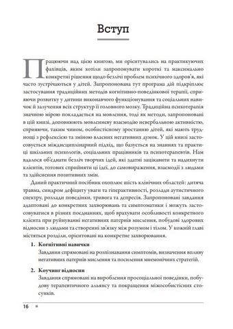 Книга є збіркою вправ для підкріплення традиційних методів когнітивно-поведінкової терапії та сприяє розвитку у дитини соціальних навичок. На відміну від традиційної психотерапії у цій книзі мовленнєва взаємодія доповнюється невербальною активністю, сприяючи особистісному зростанню дітей, які мають труднощі з рефлексією та зміною негативних думок. В основу книги покладено знання та досвід шкільних психологів, соціальних працівників та психотерапевтів.
