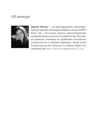 Дарлин Лансер — д-р юриспруденции, лицензированный терапевт по вопросам брака и семьи (LMFT) более чем с 25-летним опытом консультирования индивидуальных клиентов и семейных пар. Регулярно проводит семинары по проблемам самооценки, созависимости и пагубных привычек.