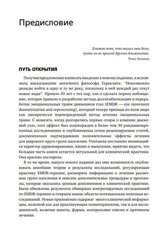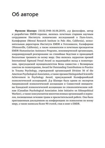 Создатель EMDR-терапии Фрэнсин Шапиро рассматривает теоретические и эмпирические основы терапии, подробно описывает этапы лечения и предоставляет учебные материалы. В новом издании изложены новые достижения в области EDMR-терапии, результаты клинических и нейрофизиологических исследований, полученные за последние 15 лет, а также новые и модифицированные протоколы и процедуры.В книге обсуждаются дополнительные области применения EMDR-терапии, включая лечение сложных травм, зависимостей, боль, депрессию и моральные травмы, а также меры реагирования после стихийных бедствий. Приложения к книге содержат протоколы сеансов, клинические руководства и описание инструментов для оценки достоверности и результатов лечения.
