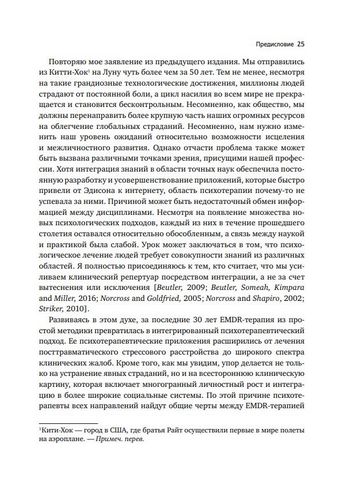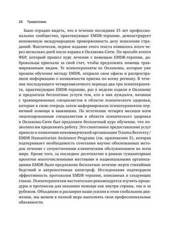 Создатель EMDR-терапии Фрэнсин Шапиро рассматривает теоретические и эмпирические основы терапии, подробно описывает этапы лечения и предоставляет учебные материалы. В новом издании изложены новые достижения в области EDMR-терапии, результаты клинических и нейрофизиологических исследований, полученные за последние 15 лет, а также новые и модифицированные протоколы и процедуры.В книге обсуждаются дополнительные области применения EMDR-терапии, включая лечение сложных травм, зависимостей, боль, депрессию и моральные травмы, а также меры реагирования после стихийных бедствий. Приложения к книге содержат протоколы сеансов, клинические руководства и описание инструментов для оценки достоверности и результатов лечения.
