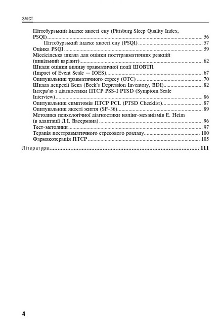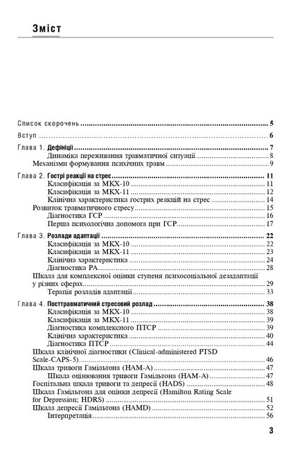 У навчальному посібнику подано систему надання медичної допомоги пацієнтам із гострим стресовим розладом (ГСР), посттравматичною стресовою реакцією (ПТСР) та розладами адаптації (РА). Широко розкрито діагностичний підхід, який використовують у галузі психічного здоров’я. Верифіковано психодіагностичні уміння, наявність та ступінь тривоги, безсоння, суїцидальні тенденції, систематизовані шкали та методи обстеження у зручному форматі. У посібнику виконано порівняння останньої Міжнародної класифікації хвороб 11-го перегляду з описаною попередньою класифікацією. Наводяться основні клінічні прояви, диференціальна діагностика, сучасна терапія ГСР, ПТСР, РА на основі клінічного досвіду та аналізу світової медицини.