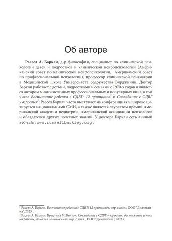 Рассел А. Баркли, д-р философии, специалист по клинической психологии детей и подростков и клинической нейропсихологии (Американский совет по клинической нейропсихологии, Американский совет по профессиональной психологии), профессор клинической психиатрии в Медицинской школе Университета содружества Вирджинии. Доктор Баркли работает с детьми, подростками и семьями с 1970-х годов и является автором многочисленных профессиональных и популярных книг.