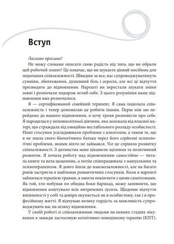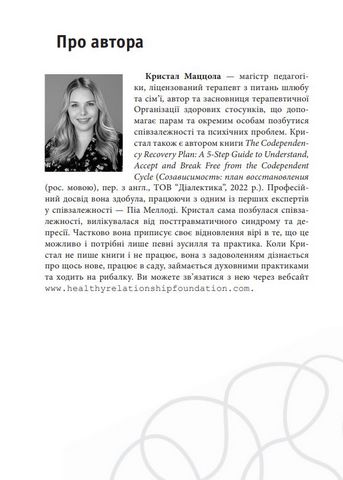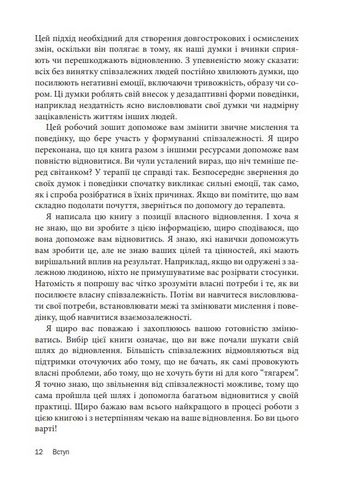 Отримайте знову сенс життя. Робочий зошит від автора книги The Codependency Recovery Plan: A 5-Step Guide to Understand, Accept, and Break Free from the Codependent Cycle (План звільнення від злізності: 5 кроків до її розуміння, прийняття і подолання) — це всеосяжний збірка науково обґрунтованих стратегій і завдань для тих, хто бажає вирватися з шаблонів взаємозалежності та повернутися до повноцінного життя. Ця книга навчить справлятися з депресією й тривожністю, які так часто супроводжують незалежні відносини. З цим робочим зошитом шлях відновлення стане очевидним. Відкрийте для себе ефективність вправ когнітивно-поведінкової терапії (КПТ) для поставлення особистих цілей, зміни патернів негативного мислення, виявлення тригерів, керування конфліктами та власними емоціями та зниження рівня стресу. Минуть рефлексії наприкінці кожного розділу допоможуть вам підвести підсумки та підживити мотивацію на шляху відновлення.