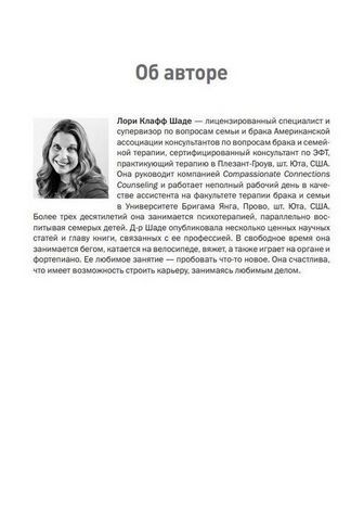 Лори Клафф Шаде — д-р философии, лицензированный специалист и супервизор по вопросам семьи и брака Американской ассоциации консультантов по вопросам брака и семейной терапии. Лори начинала свою карьеру в качестве ассистента на кафедре терапии брака и семьи в Университете Бригама Янга, а также работала ассистентом в Университете Долины Юты. Сейчас она ведет терапевтическую практику в Плезант-Гроув, шт. Юта, США. Специализация д-ра Шаде — эмоционально-фокусированная терапия пар. Более трех десятилетий она занималась психотерапией, параллельно воспитывая семерых детей, и опубликовала несколько ценных научных трудов, связанных с ее профессией.