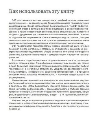 Эта рабочая тетрадь — практическое руководство для пар. Она поможет в формировании надежного стиля привязанности и в повышении степени удовлетворенности отношениями. В ней описаны конкретные приемы, которые помогут понять негативные паттерны в отношениях и заменить их более открытыми и гибкими конструктивными моделями поведения. Книга помогает парам вывести отношения на качественно новый уровень, восстановить эмоциональную связь и преодолеть трудности в отношениях.