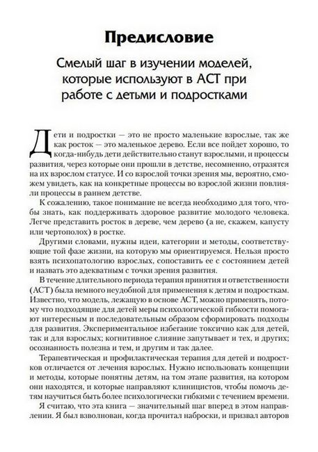 В книге изложены навыки и советы, основанные на доказавшей свою эффективность терапии принятия и ответственности (ACT), с помощью которых подростки смогут справиться с трудными эмоциями, определить свои ценности, обрести осознанность и жизненную энергию, а также развить позитивные отношения с друзьями и семьей. Приведенные в этой книге научно обоснованные методы направлены на развитие сильного чувства собственного достоинства и уверенности, которая необходима подросткам при трудном переходе во взрослую жизнь. Навыки, которые можно развить с помощью этой книги, помогут заложить основу для счастливой и здоровой взрослой жизни. Эту книгу обязательно должен изучить каждый, кто работает с подростками.