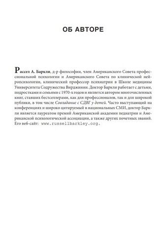 Рассел А. Баркли, д-р философии, член Американского Совета профессиональной психологии и Американского Совета по клинической нейропсихологии, клинический профессор психиатрии в Школе медицины Университета Содружества Вирджинии. Доктор Баркли работает с детьми, подростками и семьями с 1970-х годов и является автором многочисленных книг, ставших бестселлерами, как для профессионалов, так и для широкой публики, в том числе Совладание с СДВГ у детей. Полное авторитетное руководство для родителей. Часто выступающий на конференциях и широко цитируемый в национальных СМИ, доктор Баркли удостоен премий Американской академии педиатрии и Американской психологической ассоциации, а также других почетных званий.