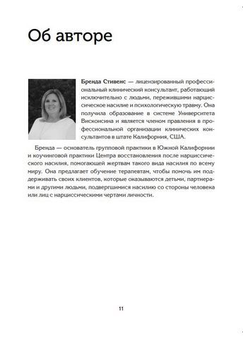 Бренда Стивенс — лицензированный профессиональный клинический консультант и основатель Центра восстановления после нарциссического насилия, который помогает жертвам нарциссического насилия по всему миру. Бренда Стивенс предлагает обучение другим терапевтам, чтобы помочь им поддерживать своих клиентов — детей, партнеров и других людей, подвергшихся насилию со стороны человека с нарциссическими чертами личности.